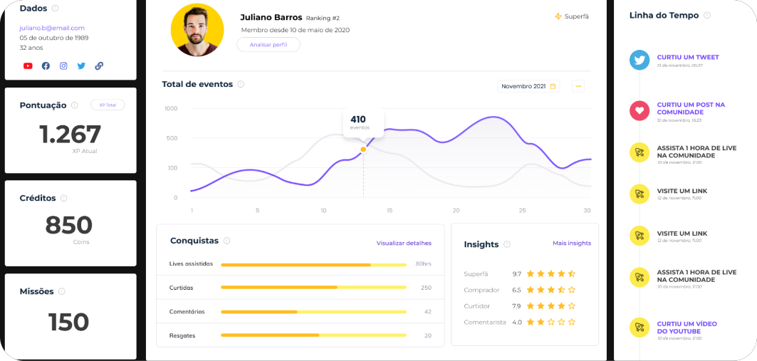 Acompanhe tudo em um dashboard exclusivo com perfil, comportamento e engajamento.